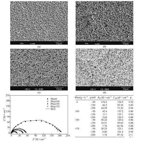 復合電極中第二相有機顆粒往往是指導電聚合物顆粒,其自20世紀70年代興起以來,由于特殊的導電及催化性能而備受關(guān)注。研究了聚乙烯(PE)及聚噻吩(PTh)復合Ni-Mo合金電極的催化性能。Ni-Mo/PE復合電極的鍍液組成為0.035mol/L鉬酸鈉、0.75mol/L硫酸鎳、0.45mol/L檸檬酸鈉、10 g/L聚乙烯粉末(需預鍍Ni)、溫度為25℃、pH=6~7。當沉積電流密度為50mA/cm2時,所得鍍層PE含量最大,同時其催化活性也最高,交換電流密度達到1.15mA/cm2,較Ni-Mo合金的催化性能提升了一個數(shù)量級。推測復合電極中嵌入的聚合物局部屏蔽了電極表面電化學過程的非活性位點,從而提高了析氫反應的動力學過程。Ni-Mo/PTh電極的復合鍍液是將Ni-Mo基礎(chǔ)鍍液與噻吩(Th)單體的高氯酸溶液按3∶1混合配置而成,制備過程中電沉積與電聚合過程同時發(fā)生。較大沉積電流密度有利于鍍層中Th復合含量的增加,制備出的NI-Mo/PTh復合電極展現(xiàn)出粗糙的表面結(jié)構(gòu)。研究發(fā)現(xiàn),具有較低PTh含量的電極析氫活性較高,其中含4.6%PTh的復合電極的活性最佳,與Ni-Mo電極相比,復合電極的交換電流密度提升了一倍。在鎳的電鍍液中加入粒徑為1~30μm聚苯胺(PAni)顆粒,通過共沉積得到聚苯胺修飾鎳電極,考察了不同濃度PAni顆粒對復合電極表面形貌及催化活性的影響,結(jié)果如圖2所示,發(fā)現(xiàn)較高PAni濃度有助于提高復合電極比表面積,同時降低析氫過程的電荷傳遞電阻(Rct)。