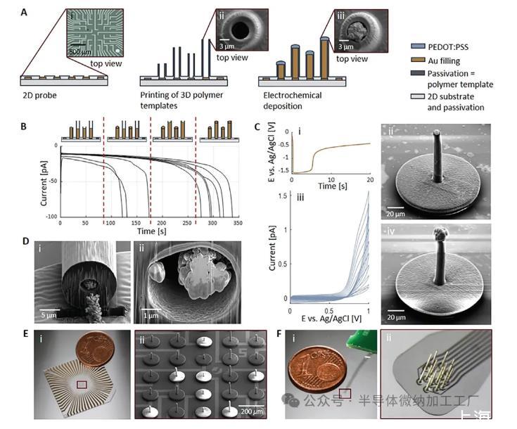 Fig2:3D MEA的制造。A)通過(guò)打印3D聚合物模板(A ii)以及模板輔助電沉積Au和PEDOT:PSS在平面MEA基板(A)上制造3D電極。通過(guò)仔細(xì)控制電流,可以在柱的頂部形成帽(A iii)。B)模板輔助電化學(xué)沉積金在高度為35和65μm的直柱內(nèi)。在計(jì)時(shí)電流法過(guò)程中,使用-1.3 V的恒定電勢(shì)。電流-時(shí)間曲線展示了用Au填充不同高度的柱子的電化學(xué)沉積過(guò)程的四個(gè)階段,當(dāng)測(cè)量的電流開(kāi)始呈指數(shù)增加時(shí)停止,從而表明Au填充到達(dá)柱子的頂端。C)在第二個(gè)沉積步驟中,電流固定在-100 nA持續(xù)20 s(C),以創(chuàng)建光滑且小的金帽(C ii)。以下PEDOT:PSS沉積通過(guò)循環(huán)伏安法進(jìn)行2-10個(gè)循環(huán)(在(C iii)中循環(huán)數(shù)為10),具體取決于PEDOT:PSS帽的所需尺寸(C iv)。D)聚焦離子束(FIB)-在底部切割一根單獨(dú)的柱子,顯示柱子的壁厚約為4μm(D)和頂端(D ii)。E)制造結(jié)果顯示了剛性3D MEA裝置(E)和具有不同高度(40–100μm)3D打印柱的陣列的放大圖片(E ii))。F)制造結(jié)果顯示靈活的3D MEA(F)和高度為500μm的3D打印柱的放大圖片(F ii)。