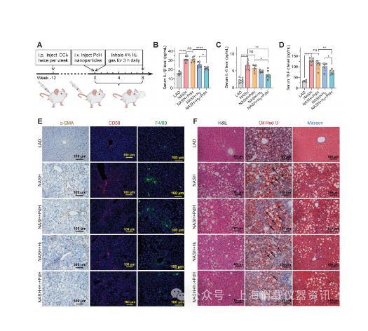 圖5、PdH注射加氫氣吸入緩解中度NASH的治療效果。模型構建和治療程序(A),血清細胞因子水平包括IL-1β(B),IL-6(C),TNF-α(D),IHC和α-SMA,CD68和F4/80的免疫熒光檢測肝切片(E)的水平,以及治療結束時肝切片的H&E、油紅O(指向代表中性甘油三酯和脂質的紅點的黑色箭頭)和馬松三色染色(藍色代表膠原蛋白)圖像(F)。