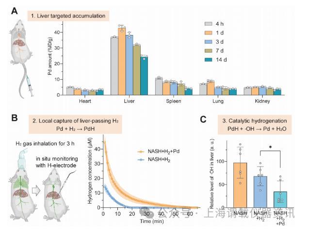 圖3、Pd納米顆粒在NASH模型中的肝臟靶向積累、局部氫捕獲和催化氫化行為。靜脈注射后Pd納米顆粒的生物分布和肝內滯留(A),通過氫電極實時原位監測NASH小鼠注射Pd和3小時氫氣吸入后肝臟中的氫濃度(n=6)(B),Pd納米顆粒催化氫化清除NASH小鼠肝臟中·OH的能力(C)。