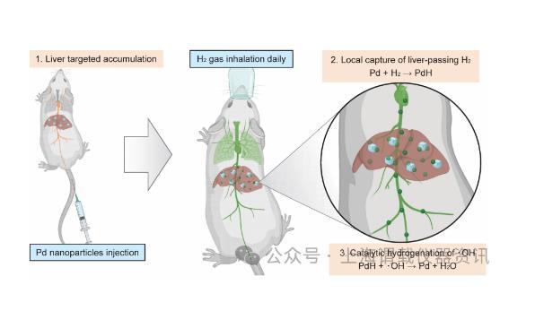 圖1、Pd納米粒子在肝臟中進行局部氫捕獲和催化?OH氫化的治療策略和機制示意圖。