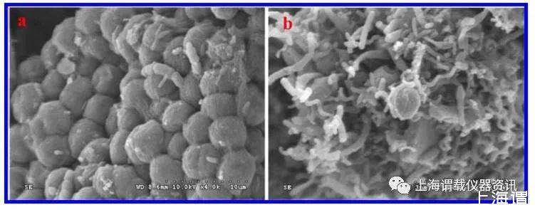 圖3、24小時后,在(a)參照對比組和(b)藻/細菌共培養系統中掃描電子顯微鏡圖像的微囊藻菌FACHB905和單一不動桿菌的掃描顯微鏡示意圖。