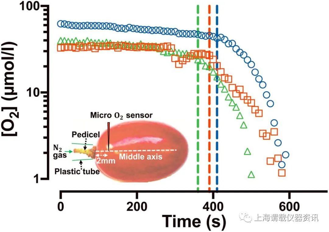 微電極的應用:使用了尖端直徑為25微米的克拉克型氧氣微電極穿刺到葡萄果漿中測試葡萄果漿中的氧濃度剖面,并且也使用了clark型氧微傳感器和微呼吸系統(Unisense A/S)完成了對葡萄漿果以及葡萄漿果中的葡萄籽的呼吸測量。其中微呼吸系統的微呼吸瓶裝滿了充空氣的純凈水,不斷攪拌,并保持在25°C的水浴中。氧氣微電極在測量了整個漿果的呼吸后,用同一儀器再次測量從葡萄漿果提取出葡萄籽進行了相關的呼吸的速率測試。