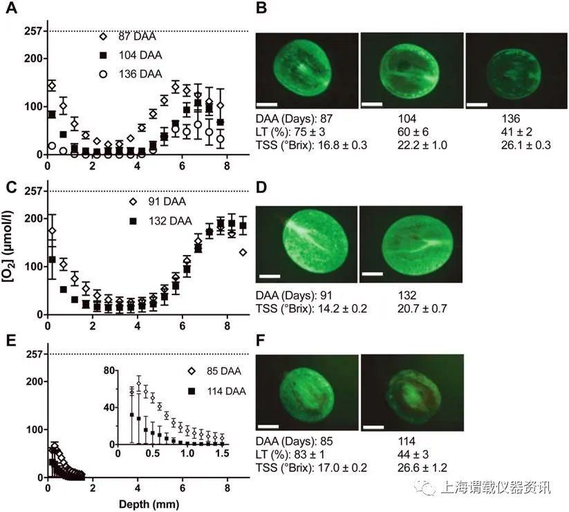 圖2、霞多麗、紅寶石無核、西拉子品種的葡萄(A、C、E)在不同成熟階段的果皮內的氧濃度的分布及在不同品種的葡萄在不同成熟階段的對應的葡萄果漿組織圖(LT)(B、D、F)。