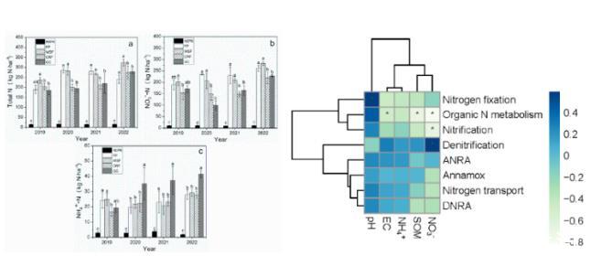 研究結果表明,施用無機氮肥的各處理,總氮淋溶率占總氮肥投入量的16.5%~30.7%;在同等施氮量的情況下,水溶肥處理的氮淋失率最高(20.2%~29.0%),而生草處理和包膜尿素處理的氮淋失率顯著較低(分別為17.0%~24.9%和15.2%~24.5%)。果園栽培過程中,氮素循環相關基因豐度顯著下降(17.1%~18.8%),但在組成上沒有明顯變化;樹脂包膜尿素處理和傳統農民施肥處理的N2O排放風險相關基因豐度最高;土壤pH值、土壤速效氮、有機質和電導率對土壤關鍵氮循環功能的影響呈負相關。該研究為建立果園的配套應用技術、優化施肥策略提供了數據支撐。