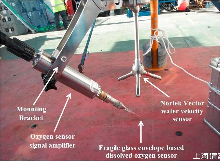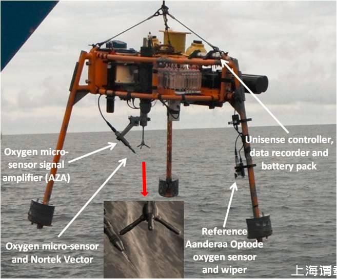 圖3、isense公司生產的渦流相關系統,采用溶解氧微傳感器、光電溶解氧傳感器和矢量水下速度計。如圖所示,此著陸器框架的上部安裝了控制器和外部電池組。該控制器可以預先編程,從一個專門的快速反應的氧微傳感器收集溶解氧的數據,該傳感器被封裝在一個易碎的玻璃外殼中。還記錄了用矢量水下速度計產生的高頻水流速度讀數。