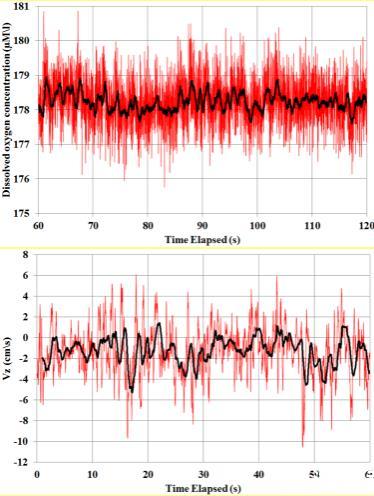 圖8.英國DY034號研究巡航船應用unisense渦動系統所測得的底棲生物a測量點60秒剖面的原始溶解氧和同處原始水下垂直速度分布圖。每個圖中都添加了滾動或移動平均線,以生成黑色的測量趨勢線。這些原始數據圖似乎表明微傳感器測得的溶解氧濃度的變化量與矢量測得的水下垂直速度的變化量之間存在某種程度的相互作用。通過對這些原始數據進行復雜分析,能得出溶解氧對沉積物通量的估計。