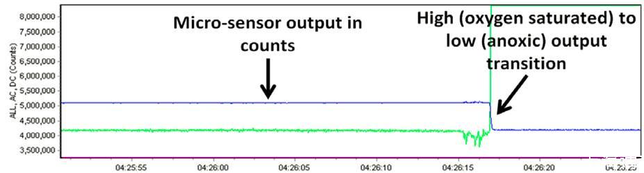 圖4、unisense渦流相關系統及氧微傳感器探頭在DY030研究巡航中的獲得的測試數據響應。Unisense渦動系統收集水流速和微傳感器溶解氧測量值的典型耐久性約為2.5天,最大采樣速率為每秒64個樣本(64Hz)。為了防止傳感器的損傷,需要對基于快速采樣溶解氧微傳感器的易碎玻璃包膜進行特殊處理。本研究中中使用的主著陸器系統需要仔細部署和恢復程序,以防止渦流相關系統,特別是玻璃微傳感器受到損壞。圖中所示的數據為2015年5月DY030研究巡航期間使用Unisense溶解氧微傳感器在底棲生物G的調查點部署前的相關數據響應。
