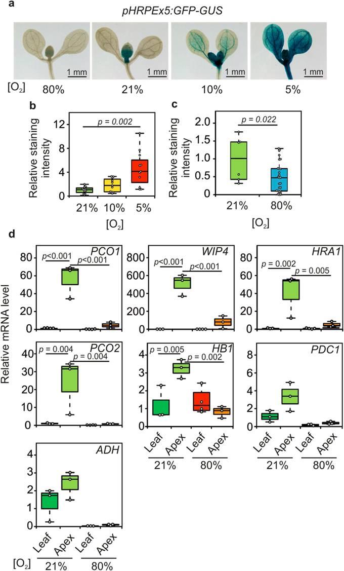 圖3、植物莖尖低氧條件下誘導(dǎo)分子缺氧反應(yīng)研究。圖a表示的是一種由5個(gè)重復(fù)的HRPE報(bào)告基因組成的合成結(jié)構(gòu)對(duì)氧的響應(yīng)性。圖b表示的是pHRPEx5:GFP-GUS基因在21%、10%和5%O2下的對(duì)應(yīng)的相對(duì)染色強(qiáng)度的定量分析。圖c表示的是pHRPEx5:GFP-GUS基因在21%和80%O2下的對(duì)應(yīng)的相對(duì)染色強(qiáng)度的定量分析。此研究結(jié)果表明,該結(jié)構(gòu)能有效地反映植物組織處的氧狀態(tài)。圖d表示的是采用RT-qPCR檢測(cè)缺氧誘導(dǎo)基因的表達(dá)。