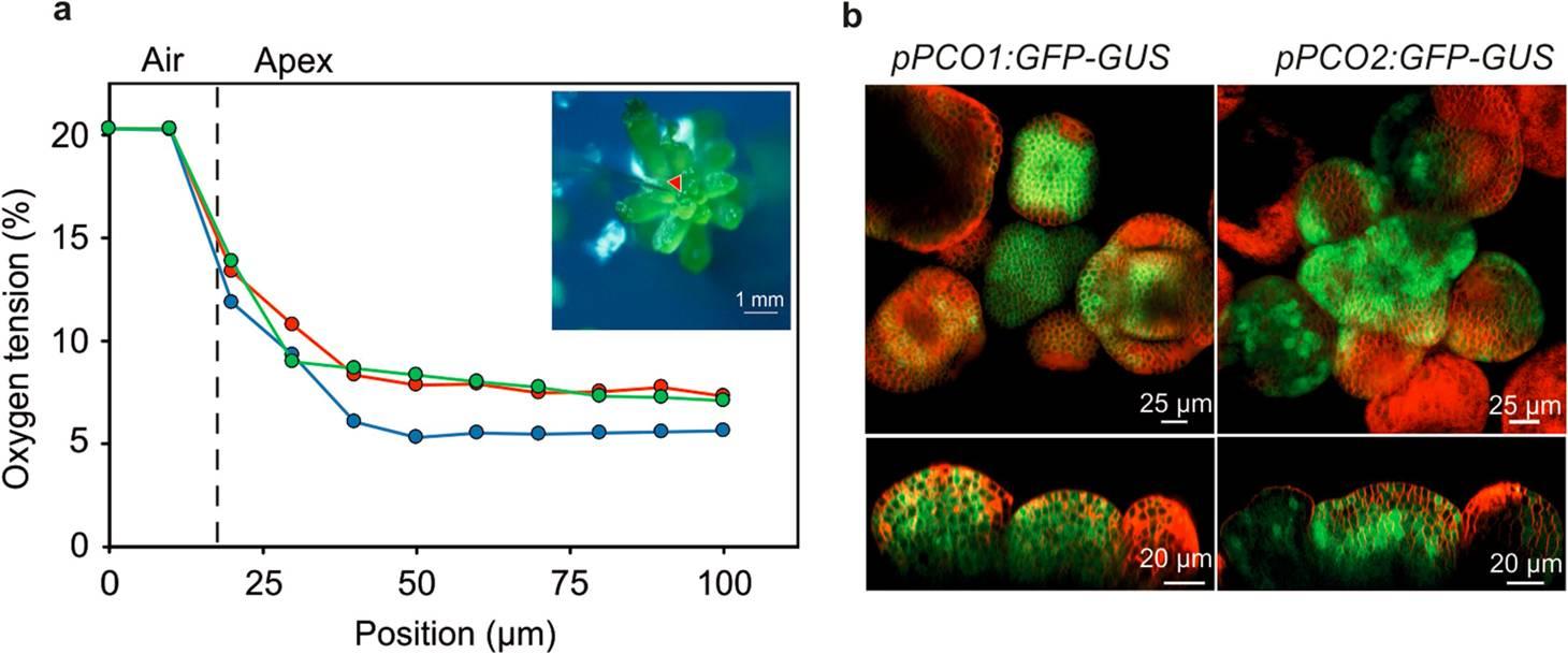 圖4、a)使用氧氣微電極穿刺入5周齡的擬南芥的植株的花序分生組織處的氧濃度剖面,其中微電極是從植物莖尖的頂端到基部的區(qū)域插入的。插圖顯示了微傳感器插入植物花序分生組織內(nèi)的實(shí)驗(yàn)裝置照片。圖b表示的是pPCO1:GFP-GUS和pPCO2:GFP-GUS對(duì)缺氧有特異性反應(yīng)的研究,pPCO1:GFP-GUS被轉(zhuǎn)化為植物的花序和花分生組織中的綠色熒光信號(hào)。