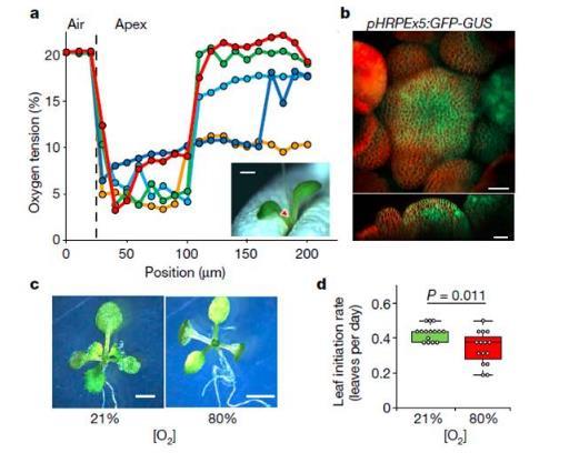 圖1、植物的莖尖分生組織(SAM)活性的保持需要一個(gè)低氧生態(tài)區(qū)域。圖a表示的是通過(guò)微電極沿植物莖尖組織的頂頭方向測(cè)試SAM區(qū)域的氧濃度變化,圖中的顏色代表的是單次測(cè)試。圖b表示的是擬南芥花序分生組織中GFP的表達(dá)受缺氧反應(yīng)啟動(dòng)子(pHRPE)的驅(qū)動(dòng)。圖c表示的是在常規(guī)氧條件下和高氧條件下生長(zhǎng)的植物的表現(xiàn)。圖d表示的是在常氧和高氧條件下生長(zhǎng)的擬南芥葉片起始速率.