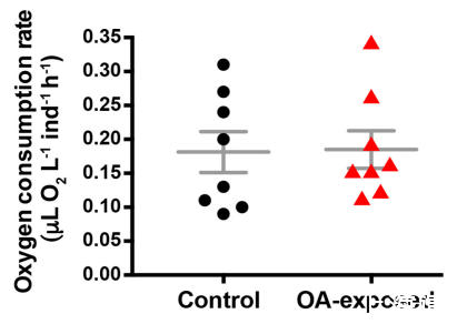 圖4、使用unisense微呼吸系統測試白鱸幼體的耗氧率。在50分鐘內測量了來自EXP 1的白鱸幼體(5只為一組)的耗氧率,并將其顯示為時間的函數。在對照組(黑色,圓圈)和OA暴露(紅色,三角形)處理中飼養的幼體之間,未檢測到耗氧率存在顯著差異(t(14)=0.0918;p=0.928)。