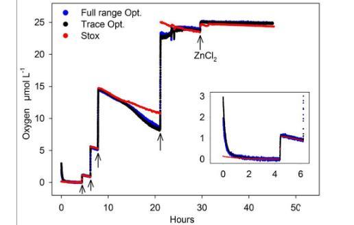 圖3、實驗1:光學氧傳感器和全量程光學氧傳感器(全范圍)和STOX傳感器測試體系中的氧濃度的示意圖。脫氣水依次富集,通過加入已知體積的飽和空氣水(箭頭)來補充氧氣。消耗率計算后,增加的O2隨時間減少。30小時后加入ZnCl2停止生物活性。插圖表示的是在最初幾個小時內的光電子初始適應情況。