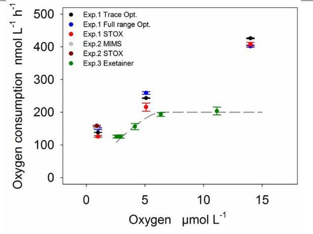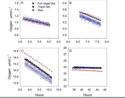 研究發現所有方法均適用于O2消耗量的檢測,反應速率在幾個nmol L-1h-1和低濃度O2的范圍內,研究結果測試出了海洋環境下的海洋生物預期的氧的消耗速率。其中氧的消耗速率的具體限制需要控制如微電極傳感器的漂移(STOX)和氧的污染(Exetainer)的最小化以達到低檢測限,并充分利用傳感器帶來的特定精度和測量頻率。潛在檢測限為24小時潛伏期為幾個nmol L-1h-1或更少,但各有差異的方法。對于連續測量和極低的氧消耗速率,推薦使用STOX傳感器(unisense微電極)和光電法。研究發現在低氧濃度下培養是一個特殊的挑戰,比如聚集體的存在是否可以限制擴散速率預期濃度低于20umol L-1,并要考慮有限的氧氣消耗的本身擴散,樣品需要更加精細化的處理,以便更好地在原位條件下繁殖并考慮到其聚合體的大小和分布。