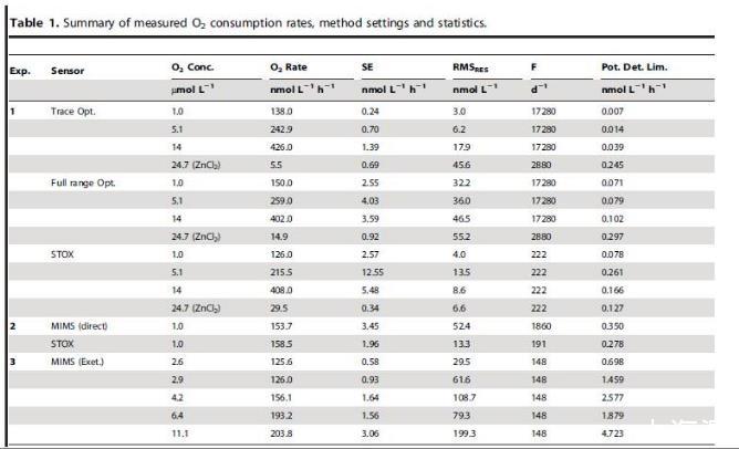 深海水域的微生物氧呼吸具有重要的生態學意義,但人們對其研究甚少,主要是方法上的困難較多。尤其是微生物的呼吸測量是具有挑戰性的,因為需要高分辨率的氧氣濃度測量設備。最近關于氧傳感技術(丹麥unisense研發的微電極技術)的改進克服當下研究這些問題的局限性具有很大的潛力。本論文的研究人員主要比較了三種不同的方法來測量低氧濃度下的耗氧量,利用克拉克型氧傳感器(STOX),光學氧傳感器(optodes),質譜結合18-18O2標記法。研究人員通過在不同的方法中,以及同樣的實驗設置中,對比研究三種方法的氧濃度和耗氧量一致性評價,并采用高耗氧量法測定了30-400 nmol L-1h-1的耗氧量精度及相對標準誤差。