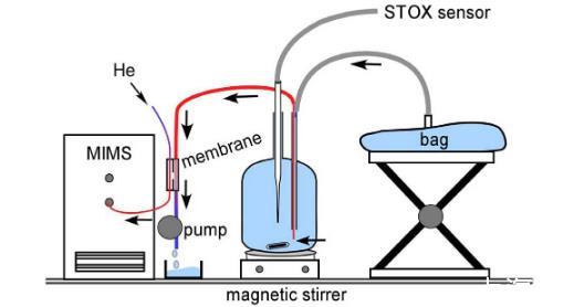 圖2、水培養瓶用18O2標記。標記的水以0.73 mL min-1的流量泵出瓶子的薄膜入口穿過質譜儀。水是通過一個氣密袋中脫去無標記氧的水后定位在上邊緣的壓力進入取而代之。氦氣作為載體氣體,具有質量穩定、速度快的特點。