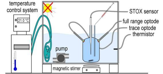 圖1、實驗培養裝置圖。孵育瓶置于恒溫水浴中。兩個光學氧傳感器被放置在瓶的上半部分相對的兩側。該STOX傳感器是通過一個玻璃管插入瓶的中心。校正的過程是通過壓力補償口加入已知的空氣飽和量的水。容器下方通過磁力攪拌器旋轉。