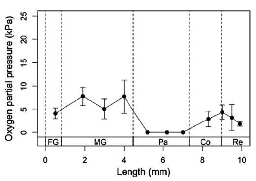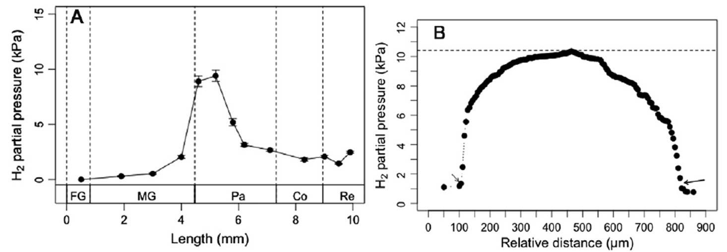 圖5、黑翅土白蟻腸道系統的氫分壓分布情況。圖A表示的是氫氣微電極測量顯示在各腸腔中心的氫分壓分布廣泛,直腸顯示有一定氫氣積聚和相對較高的氧氣分壓約2.5±0.1千帕。圖B表示的是黑翅土白蟻后腸龐大區前部的氧分壓呈典型的徑向分布。最高的氧氣分壓(10.4千帕)被記錄在腸腔中心,而值越朝腸壁越小(1.2千帕)。