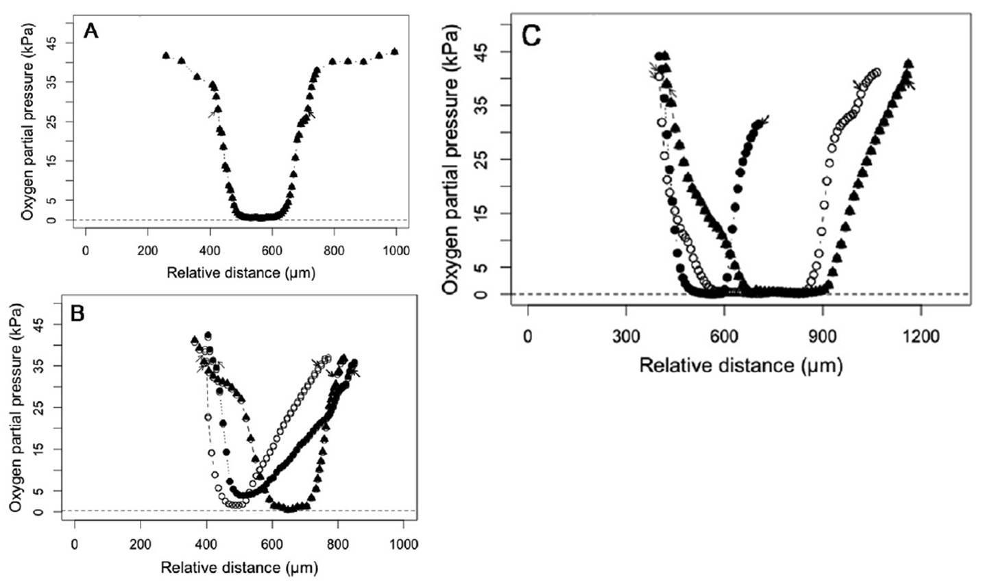 圖2、黑翅土白蟻主要腸腔室的氧分壓的徑向分布。圖A表示的是黑翅土白蟻腸道系統從腸壁到腸隔室中心的徑向氧含量分布。圖B表示的是黑翅土白蟻中腸中間的氧濃度從腸壁到內腔中心的變化情況?!瘢ㄇ澳c)△(中腸)○(中腸的后半部分)圖C表示的是腹和結腸(后腸)區域內的氧分壓分布情況?!瘢ㄇ案梗鳎ê笪福穑ê竽c)。