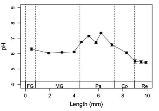 圖3、黑翅土白蟻腸道系統的軸向分布。沿腸道可檢測到一個狹窄的值范圍。前腸的為6.3±0.1;黑翅土白蟻中腸的前,中和后區,PH值依次略有下降。黑翅土白蟻后腸的囊狀胃,腸腸的連接區域幾乎增長了1個PH單位;后腸龐大區的前部和中位分別顯著增加到7.0±0.0和6.7±0.0。pH高值分別為在后腸龐大區后部,其值高達7.3±0.0。但是在直腸區域,它急劇下降了1-1.5個pH單位。