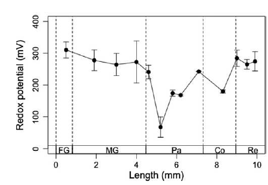 圖4、黑翅土白蟻腸道系統的軸向氧化還原電勢分布。黑翅土白蟻每個腸區域的中心的氧化還原電位,介于310亳伏到70±30毫伏(位于前腹)之間。這表明在腸道系統各個位置的氧化還原電位呈高度動態。前腸有最高的氧化還原電勢。中腸輕微下降,后腸的前,中和后區顯示波動。最低的氧化還原電位被觀測在腸道龐大區的前部。