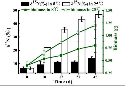 圖5、45天培養實驗中(不同溫度下)收集來自不同實驗條件下的沉淀物15N的含量變化情況。