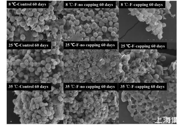 圖3、不同處理體系中藻類細胞在8℃、25℃和35℃下孵育60天后的對應的掃描電鏡