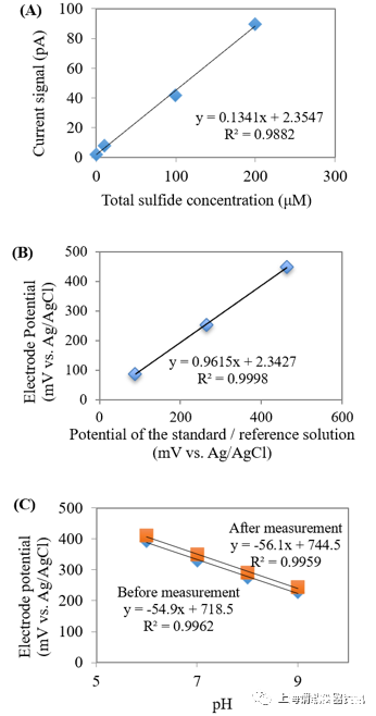 圖1、H2S(A)、ORP(B)和pH(C)的校準曲線,使用相應的微傳感器(藍點表示測量后的數據;紅點表示測量前的數據)