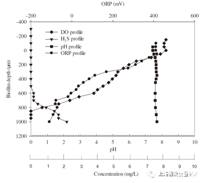 微電極的應用:使用自丹麥Unisense開發的安培型微傳感器包括尖端直徑為50μm的H2S(H2S-50)微型傳感器和尖端直徑為50μm的O2(OX-50)微型傳感器。用Na2S稀釋系列(0-10 mM)對H2S微傳感器進行四點校準。在即將進行微傳感器測量之前,將平坦的基質生物載體從反應器中取出并放入培養板中。將來自反應器的50 mL水緩慢倒入培養板中,以將生物膜完全浸入水中。立即對生物膜進行微傳感器測量。使用H2S和O2微電極傳感器的測量過程中,將微傳感器安裝在微操縱器上,并將微傳感器的尖端恰好定位在主體之間的界面上方水和生物膜表面。然后將微傳感器尖端以50μm至100μm的步長推進到生物膜中通過操作微操縱器來完成。該信號由皮安計表(PA2000,Unisense,丹麥)記錄。在電位ORP和pH微傳感器測量期間,將參比電極尖端浸入培養板中的水中,并放置在散裝水和生物膜表面之間的界面正上方。