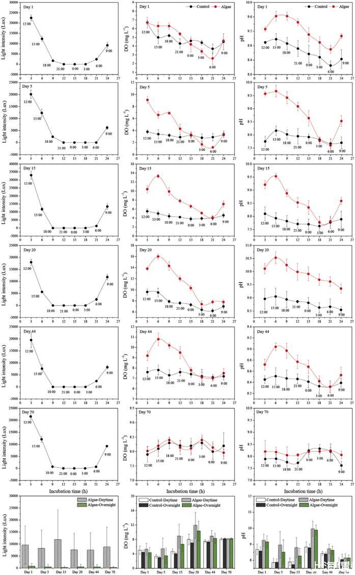 圖2、在一個完整的一晝夜的循環(huán)周期中,控制池和藻類處理池的水柱樣品中光強度、DO和pH值的變化情況。白天和夜間的所處的時間段分別指的是從早上6點到下午18點,從下午18點到早上6點。分別給出這些時間段測試出的光強度、DO和pH值(所有的測試值為三次重復測量的平均值)
