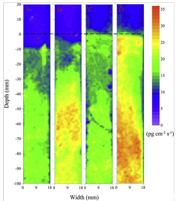 圖5、應用DGT法對進行對比組水體和沉積物和藻類處理的水體和沉積物測試獲得的不穩(wěn)定S(-II)濃度的二維分布圖。圖A和B分別)分別在第44天、日間及夜間時間段對應的對比組水體和沉積物和藻類處理的水體和沉積物中的不穩(wěn)定的S(-II)濃度;圖C和D分別表示的是在第44天時藻類處理沉積物中白天和晚上的不穩(wěn)定的S(-II)濃度。