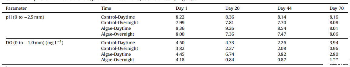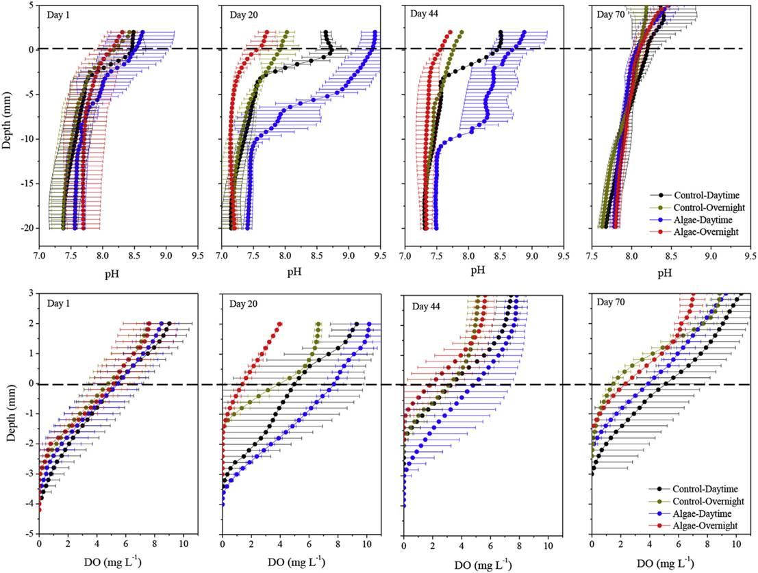 圖3、對比參照沉積物樣品和藻類處理后的沉積物樣品在白天和夜間不同時間段的pH值和DO值,深度為0對應水平虛線表示的是沉積物-水界面(SWI)。所有測試給出的值為三次重復測量的平均值。