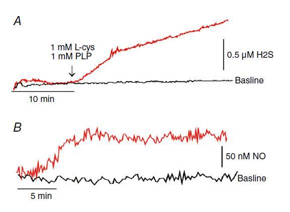 圖1、老鼠胃底平滑肌所產(chǎn)生硫化氫和一氧化氮。其中圖A的紅色曲線代表的是胃部基底組織中L-半胱氨酸和吡哆-5-醛磷酸鹽作用產(chǎn)生的硫化氫濃度。圖B中的紅線表示的是追蹤胃部組織中未加任何物質(zhì)所產(chǎn)生的一氧化氮的濃度。黑色的基線表示的是在空白的測(cè)試,即測(cè)試系統(tǒng)中無胃部組織物質(zhì)。