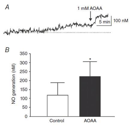 圖4、胱硫醚β-合成酶(CBS)抑制劑、AOAA對(duì)于胃部組織的一氧化氮的產(chǎn)生影響。從圖B中可以看出氨氧基乙酸能夠明顯的增強(qiáng)一氧化氮的生成量,圖A表示的是追蹤胃部組織平滑肌中一氧化氮的生成量受AOAA的影響情況。