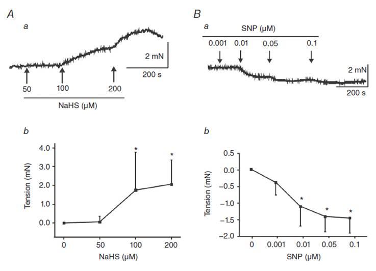 圖2、內(nèi)源性硫化氫和一氧化氮對(duì)于胃部平滑肌張力的影響。圖Aa表示的是追蹤不同濃度的硫氫化鈉對(duì)于胃部平滑肌張力的變化。圖Ab表示的是具體不同濃度的硫氫化鈉對(duì)應(yīng)于胃部平滑肌張力值,從圖中可以看出,硫氫化鈉的濃度越高,對(duì)于的胃部平滑肌的張力越大。圖Ba表示的是追蹤不同濃度的SNP對(duì)于胃部平滑肌張力的變化,圖Bb表示的是具體不同濃度的SNP對(duì)應(yīng)于胃部平滑肌張力值,從圖中可以看出,對(duì)應(yīng)的SNP濃度越大,胃部組織平滑肌的張力越小。
