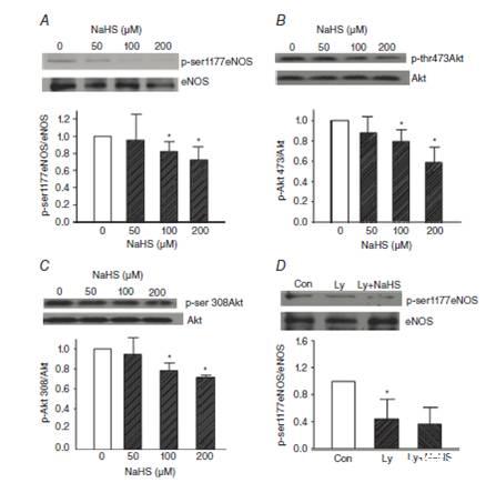 圖5、硫氫化鈉對(duì)于內(nèi)皮型一氧化氮合成酶(eNOS)和磷酸化蛋白激酶A的影響。圖A表示的是硫氫化鈉會(huì)降低序列1177處酸化的一氧化氮合成酶的表達(dá);圖B表示的是硫氫化鈉會(huì)降低序列473處磷酸化的蛋白激酶A的表達(dá)。圖C表示的是氫化鈉會(huì)降低序列308處磷酸化的蛋白激酶A的表達(dá).圖D表示的是硫氫化鈉不會(huì)改變一氧化氮合成酶的表達(dá),當(dāng)體系中加入磷酸肌醇3-激酶抑制劑(LY294002).