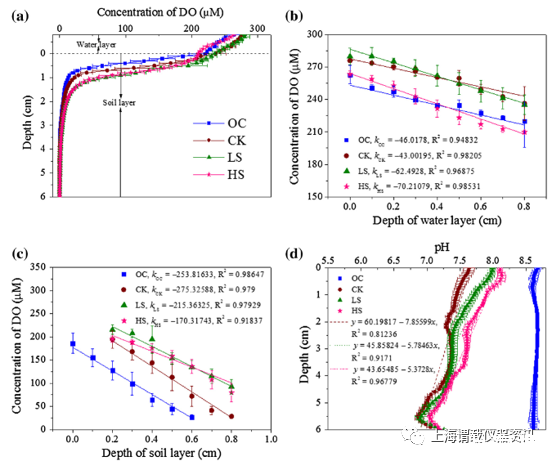 圖1、原位溶解氧(a),水層(b)和土壤(或沙/土混合)層(c)線性區(qū)域的擬合,原位pH(d)作為土壤MFC深度的函數(shù)。OC-開路控制,無沙塵。隨著深度的增加,所有樣品中的DO濃度均降低(圖a所示)。表層土壤的DO(深度0-1厘米)顯示出在水層中更快的下降。DO的擴散系數(shù)(Ds)隨著添加的沙量的增加而增加。與開路控制的土壤pH相比,所有活性MFC(CK,LS和HS)的pH(平均值)降低了1.1-1.4個單位(圖d所示)。