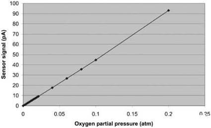 圖2、研究了氧微電極傳感器在皮安表中對應的線性響應隨傳感器尖端周圍氧分壓的變化規律
