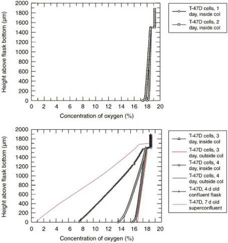 圖3、常規培養的T-47D細胞對應的氧分壓曲線(即氧分壓與瓶底以上高度距離的函數圖)。在第0天,每個燒瓶接種5×106或102個細胞,培養的細胞環境中為含5%二氧化碳的大氣。圖中的符號○□△◇分別代表的是1-、2-、3-和培養4天的培養基中的氧濃度剖面圖,每瓶對應的是0.5×106個細胞,第0天接種時,所有這些剖面圖都表示的是測量的尖端直接落在菌落的頂部的測量值。然而,對于3天和4天的細胞培養物,獲得的數據是微電極的測量尖端與菌落之間的結束位置。如(b)所示,分別培養4天和7天,每個燒瓶接種106個細胞。