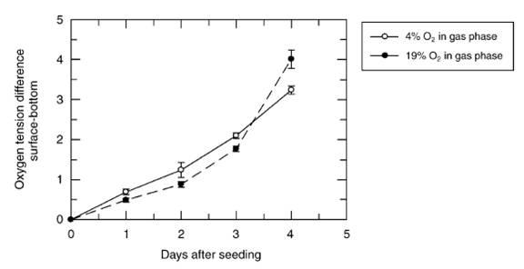 圖5、表面底部氧分壓差值對應5×105細胞/培養皿接種時間的函數圖。第7天培養時,細胞周圍的氧分壓低于缺氧呼吸水平(1.3%)。開放的圓圈表示細胞在含4%氧氣的環境中生長,封閉的圓圈表示含19%氧氣的環境中生長。