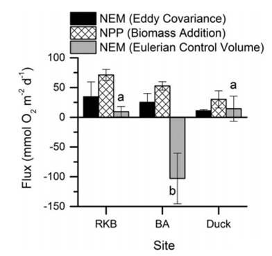 圖4、通過(guò)渦動(dòng)協(xié)方差,生物量添加和歐拉控容積法計(jì)算的各部位的凈代謝率。渦度協(xié)方差和生物量添加技術(shù)顯示了佛羅里達(dá)灣生產(chǎn)率梯度上的預(yù)期趨勢(shì)。生物質(zhì)添加和渦流技術(shù)之間的比率>2:1是因?yàn)樯镔|(zhì)添加技術(shù)僅包含海草呼吸作用和地上生產(chǎn),而渦旋協(xié)方差技術(shù)包含海草草甸中存在的所有生物。用歐拉技術(shù)測(cè)定的NEM速率有顯著差異,但在佛羅里達(dá)灣的營(yíng)養(yǎng)梯度范圍內(nèi)未顯示出預(yù)期趨勢(shì)。