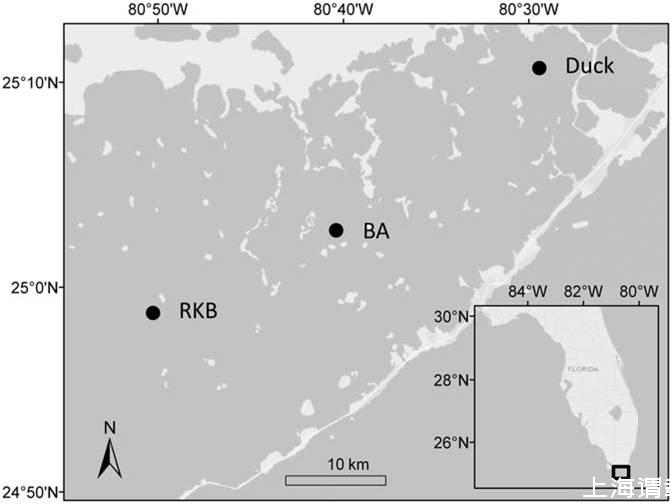 圖1、美國(guó)佛羅里達(dá)州南端的佛羅里達(dá)灣的RKB、BA、Duck區(qū)域的位置圖。