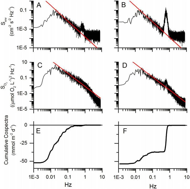 圖5、渦流協(xié)方差測(cè)量主要受電流(左)和波動(dòng)(右)的影響。垂直速度的光譜表明,這兩個(gè)電流流動(dòng)為主的條件下(圖5A)和波為主的條件下(圖5 B)存在在不同的時(shí)間,這也與O2光譜一致(圖5 c和5 d)。所有光譜均顯示出定義明確的慣性子范圍,其特征是-5/3斜線。波浪主導(dǎo)的周期在0.5-1 Hz頻帶內(nèi)顯示出明顯的波浪信號(hào),表明表面波較小。電流主導(dǎo)周期中的累積共譜表明,在更寬的頻帶(0.002-0.9 Hz;圖5E)中,通量貢獻(xiàn)較大;而在波浪頻率中,以波浪為主的周期中,通量貢獻(xiàn)更大(圖5E、圖5