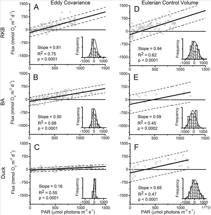 圖2、所有渦度協(xié)方差(A、B和C)和歐拉控制體積(D、E和F)的逐時(shí)盒圖,每個(gè)站點(diǎn)在一天中的每小時(shí)O2通量數(shù)據(jù)。圖3e和3f中的數(shù)據(jù)減少是由于低電流速度減少了歐拉技術(shù)的響應(yīng)時(shí)間(BA和DUCK監(jiān)測(cè)點(diǎn)在3h間隔的通量率)。圖中的方框表示上四分位數(shù)和下四分位數(shù),每個(gè)框中的線表示中位數(shù),線表示第一個(gè)離群值,圓表示離群值。圖3e和圖3f中減少的數(shù)據(jù)是由于低流速減少了歐拉技術(shù)的響應(yīng)時(shí)間(BA和Duck站點(diǎn)每隔3小時(shí)的通量率)。n是個(gè)體通量估計(jì)值的數(shù)量。PAR是測(cè)量期間內(nèi)的平均光合有效輻射。