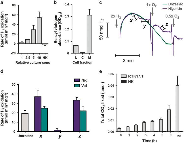圖2、嗜酸的甲烷氧化菌株(sp.RTK17.1)的氫氣氧化驅動的需氧呼吸及二氧化碳固定過程,圖a表示的是使用細胞生物氧化器培養細胞過程中的氫氣實時氧化過程速率圖。其中體系中的氫氣的實時監測是使用了unisense公司的氫氣微電極測試完成的,圖b表示的是細胞膜中氫化酶的活性監測。圖c表示的是細胞需氧呼吸過程中對氫氣的依賴,其中對于氫氣濃度的實時監測主要是基于未進行任何處理的細胞和經過尼日尼亞菌素處理的細胞。圖d表示的是基于未進行任何處理的細胞和經過尼日尼亞菌素處理的細胞的氫氣的氧化速率。圖e表示的是分批的全細胞培養過程中的二氧化碳的固定。