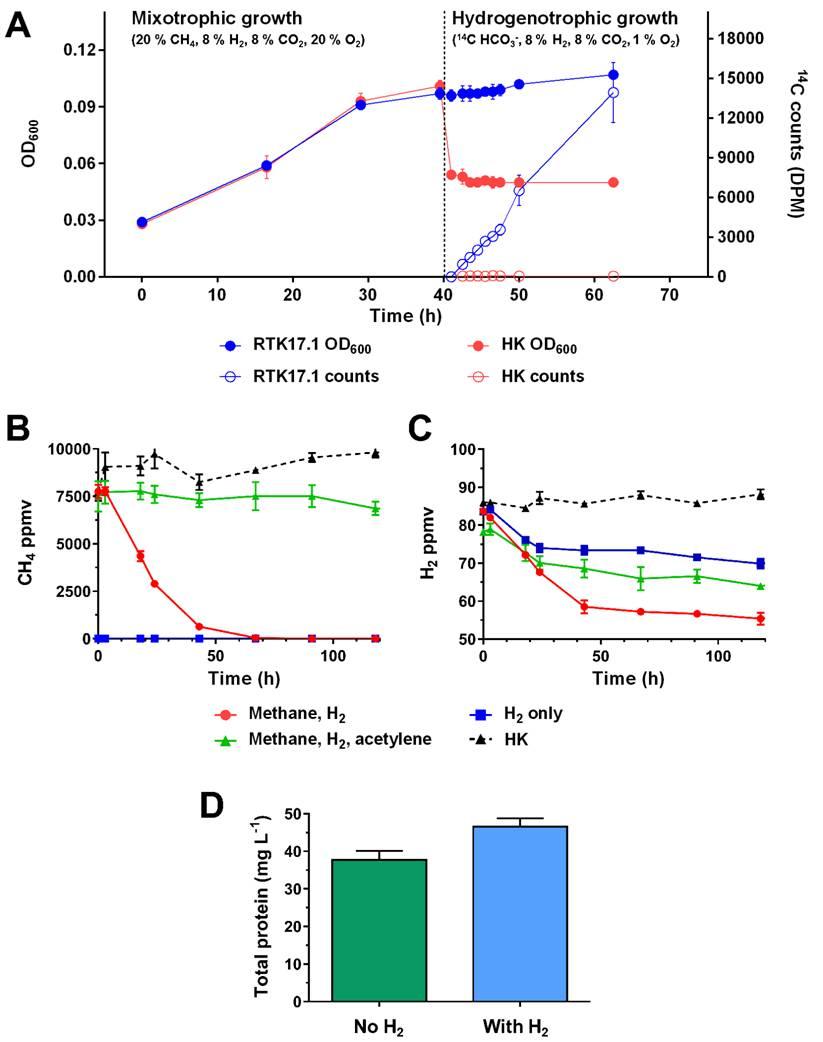 圖3、嗜酸的甲烷氧化菌株(sp.RTK17.1)在氫氣存在條件下進行批培養下混養生長和自養生長情況。圖a表示的是甲烷氧化菌在混合營養條件下和自養條件下的生長期情況。圖b表示的是混合營養生長條件下的甲烷氧化速率,以及使用了顆粒甲烷單加酶抑制劑乙炔處理后的混合營養生長條件下的甲烷氧化速率。圖c表示的氫氣的氧化速率變化情況。圖d表示的是嗜酸的甲烷氧化菌株在有氫氣條件存在以及無氫氣環境下的生長情況對比。