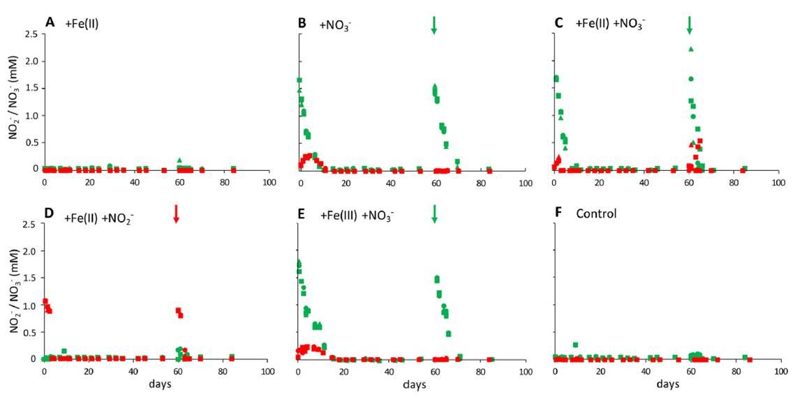 圖2、在不同的微觀環(huán)境中測試的硝酸鹽(綠色)和亞硝酸鹽(紅色)的濃度(三角形、正方形和菱形符號分別代表了三倍體系的濃度)。體系中更正的濃度(5 mM的Fe(II)和Fe(III)除了從沉積物中衍生出1mM,2mM來自于硝酸鹽和亞硝酸鹽),微觀環(huán)境的加入表示的是加入硝酸鹽或亞硝酸鹽后第60天。