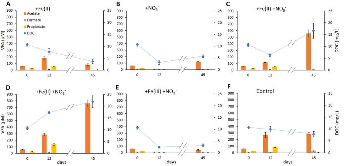 圖4、隨著時間的推移,體系中溶解的有機(jī)碳(藍(lán)色鉆石符號)和揮發(fā)性脂肪酸(棒)的濃度在設(shè)置的不同微觀環(huán)境體系中隨時間的變化情況。