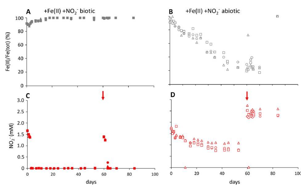 圖3、亞硝酸鹽濃度(紅色)和Fe(II)/Fe(tot)比率(灰色)在生物(填充的符號)和非生物(空心結(jié)構(gòu)符號)隨著時間的變化情況(三角形,正方形,和鉆石符號顯示的三倍體系)。其中在初始修正后的Fe[II]濃度為5 mM,亞硝酸鹽濃度為2 mM,微觀體在第60天(見箭頭)加入亞硝酸鹽后呈現(xiàn)的體系濃度情況。