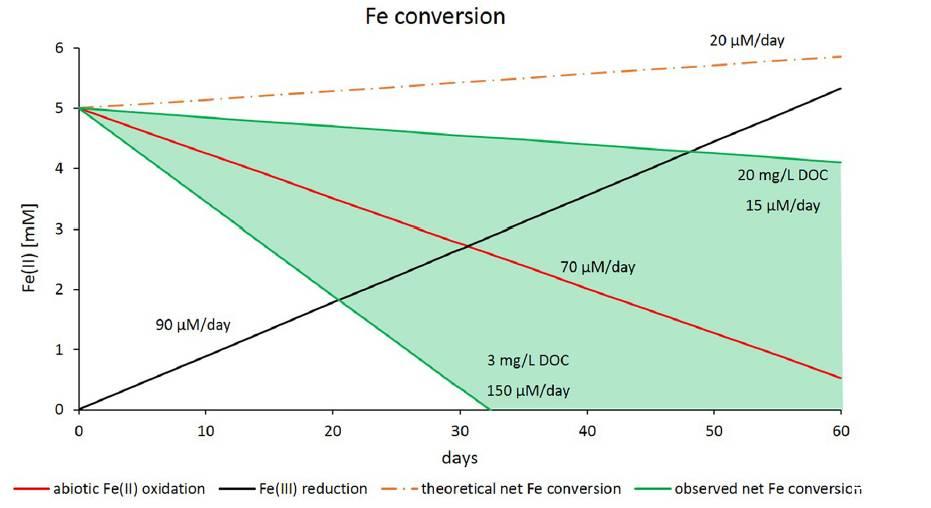 圖5、鐵的轉(zhuǎn)化率(同步顯示的凈利率,其中Fe[II]氧化和Fe[III]的還原都依賴于DOC的濃度。選用5mM的Fe(II)或Fe(III)和2mM的硝酸鹽或亞硝酸鹽進(jìn)行的微觀實驗的相關(guān)測試。理論鐵的轉(zhuǎn)換率顯示了Fe(II)的氧化反應(yīng)只與亞硝酸鹽的反應(yīng)有關(guān)的假設(shè)。理論Fe的轉(zhuǎn)換率(橙色虛線)與實測Fe的轉(zhuǎn)化率區(qū)別。
